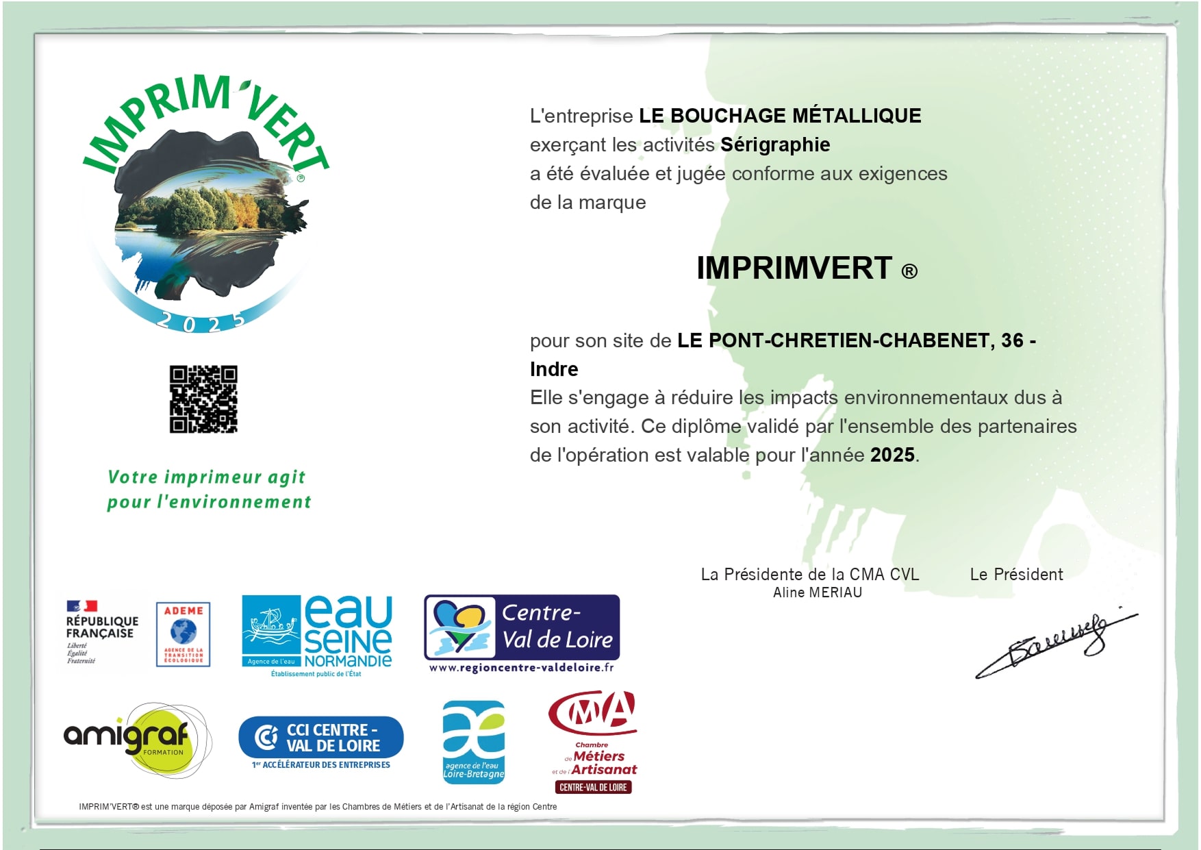 Con la certificación Imprim’Vert, reafirmamos nuestro compromiso con una producción más responsable. Esta iniciativa se basa en la reducción del impacto medioambiental de nuestras actividades: gestión rigurosa de los residuos, uso de tintas y procesos menos contaminantes, control energético. Esta etiqueta demuestra nuestra voluntad de combinar la calidad de fabricación con el respeto al medio ambiente.